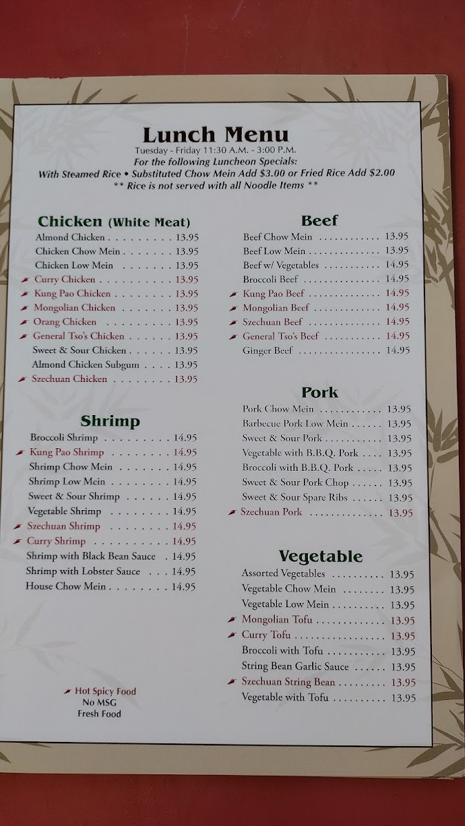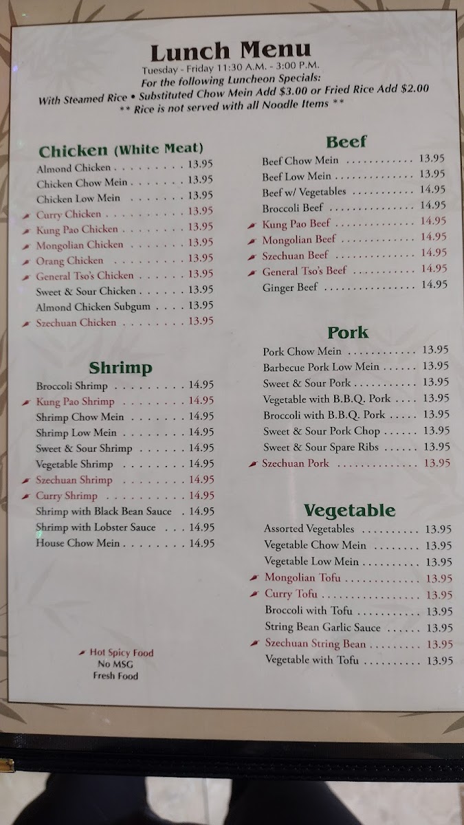 Served with choice of chow mein, fried rice, or steamed rice. Includes almonds and mixed vegetables.