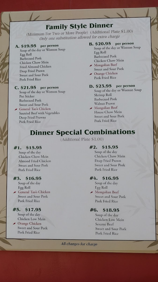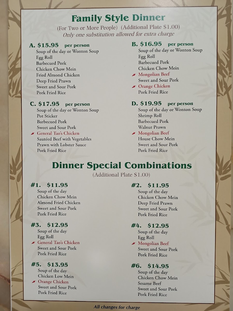Choice of chop suey mix, crispy noodles, lo mein, or soft noodles.
