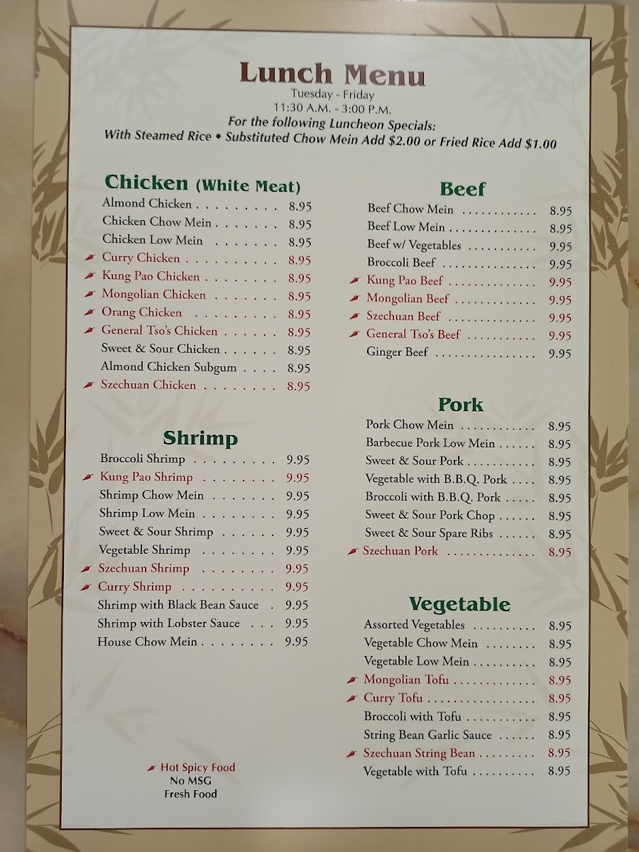 Beef stir-fried with mixed vegetables, served with your choice of chop suey vegetables, crispy noodles, lo mein, or soft noodles.
